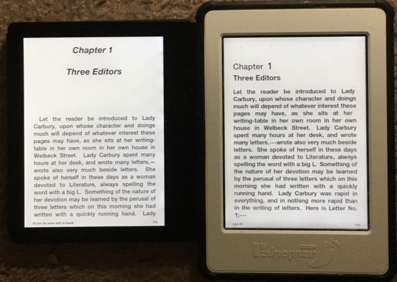 The Paperwhite screen in the photo is behind a screen protector built into a waterproof case, so that’s a built-in disadvantage. And yet its greater readability for the contrast-challenged, compared to the Oasis, is still quite evident.