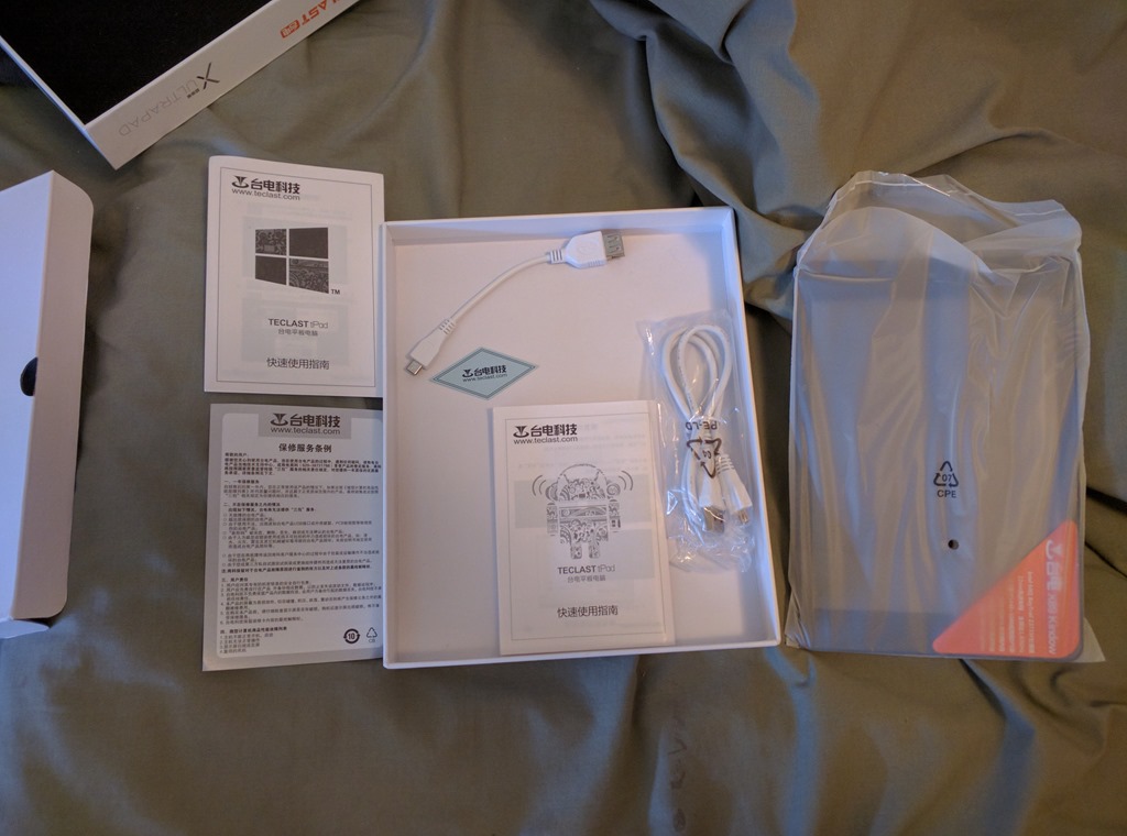 The Kindow box contained about the same stuff as the Journey, though it didn’t include a wall wart. (Which was no hardship for me, as I already have several wall multi-chargers!) It did include a USB-to-micro-USB-OTG dongle and a USB cable, as well as a number of instruction manuals in Chinese (and a rudimentary one in English).