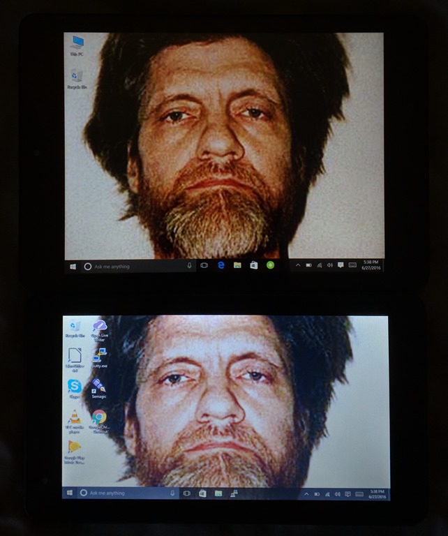 One of the applications on the Android side was a mode switcher that would reboot the tablet into Windows 10. (There’s an equivalent app pinned to the taskbar in Windows for rebooting into Android, too.) After a while playing around with Android, I tapped on that and the tablet very promptly rebooted me into Windows, at which point I was treated to a repeat of the same experience I had with the Journey—logging in with my Microsoft account and meeting Ted Kaczynski again. (I subsequently found out how to disable desktop theme sync across my computers, selected a new background, and that was effectively that.) The photo at left shows the relative screen sizes of the Kindow (top) and Journey (bottom), taken before I took the Journey back.