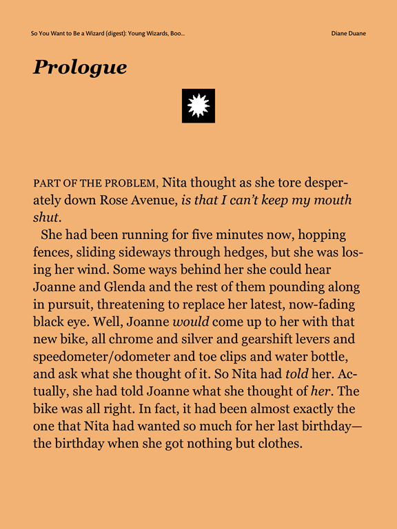 One other odd thing I just noticed, which I didn’t when I looked at the iOS Nook app in April, is that this app does away with the annoying spaces between paragraphs in Diane Duane’s Young Wizards book that shows up in the Windows version. That’s a nice little feature. It would be better if there were a way to give it a more prominent paragraph indentation, too, but oh well.