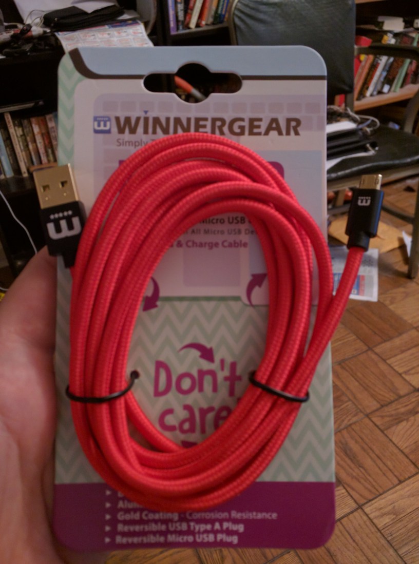 The cable isn’t cheap, as USB cables go. Amazon lists it for $20, or you can order two of them for $30 via the Indiegogo page. Android Authority Deals has it for $14 for another day or so. But WinnerGear went the extra mile to make sure it was worth it. This 6-foot cable is one of the sturdiest USB cables I’ve ever seen, with gold-plated plugs and a thick, woven nylon shell around the cable (much like the woven wrapping of the ZealSound earbuds I reviewed a couple of months ago). If there’s a downside to the length and sturdiness, it’s that the cable is simply too big to fit in the cable loops in my JanSport “Digital Burrito” cable organizer. But I can deal with that.