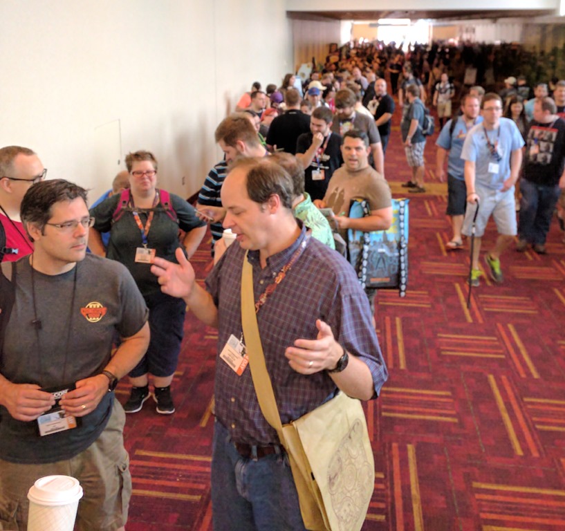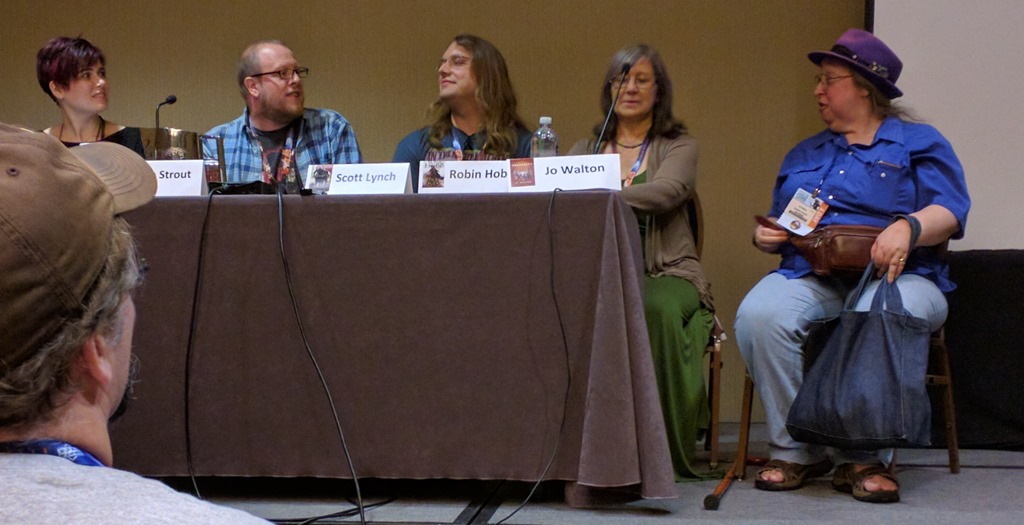 But what these panels represent is really remarkable. These panels represent renowned authors giving advice on their art and craft to an eager audience. The “Realism” panel featured Robin Hobb and Jo Walton, among others, and Baen editor Jim Minz was on “Write What You Know.” And those are just the names I recognized—I’m sure the other names would be just as familiar to people who read a bit more widely in horror and romance genres. One of the panelists said she had gotten her start in writing by attending past Gen Con Writer’s Symposiums and picking up tips from all the writers there.