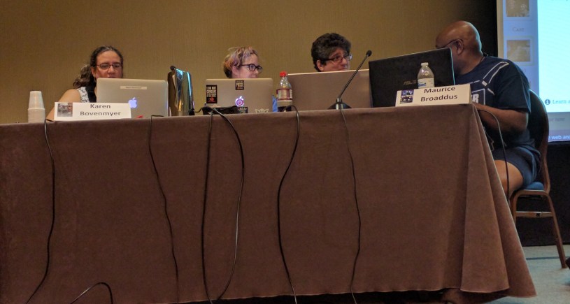 The “Storium Live” panel I attended last year was fairly bizarre and more than a little raunchy. This year’s session was much less raunchy, but very nearly as bizarre. Moderated by Storium co-founder Stephen Hood (right), the game featured authors Karen Bovenmyer, Mur Lafferty, Rich Dansky, and Maurice Broaddus taking turns writing a story live, while the authors shouted encouragement and occasionally paid money into a Worldbuilders donation chest to influence the course of the story. If you want to read what was written, the record of the game is available to the public, though it may be one of those things where you just had to be there. Many bad puns were made, much silliness was committed, a lot of money was raised for Worldbuilders, and much fun was had by all.