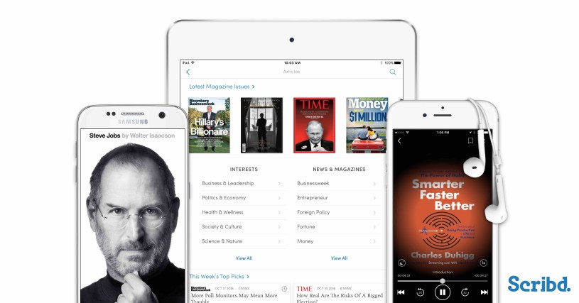 SAN FRANCISCO — November 1, 2016 — Scribd, the premier reading subscription service that offers monthly access to books, audiobooks, documents and more, is broadening its offering to give subscribers access to premium magazine content from leading media publishers including Bloomberg, Entrepreneur Media, IBT Media, New York Media, Slate Group, LLC and Time Inc. Subscribers can now enjoy access to articles from current and archive print editions of top brands such as Time, Money, Fortune, People, Bloomberg Businessweek, Entrepreneur, Foreign Policy and New York Magazine. Issues from Newsweek and The Atlantic will be added in the coming weeks. Magazines will be included in the current Scribd membership, at no extra cost, in addition to books, audiobooks, documents and more.