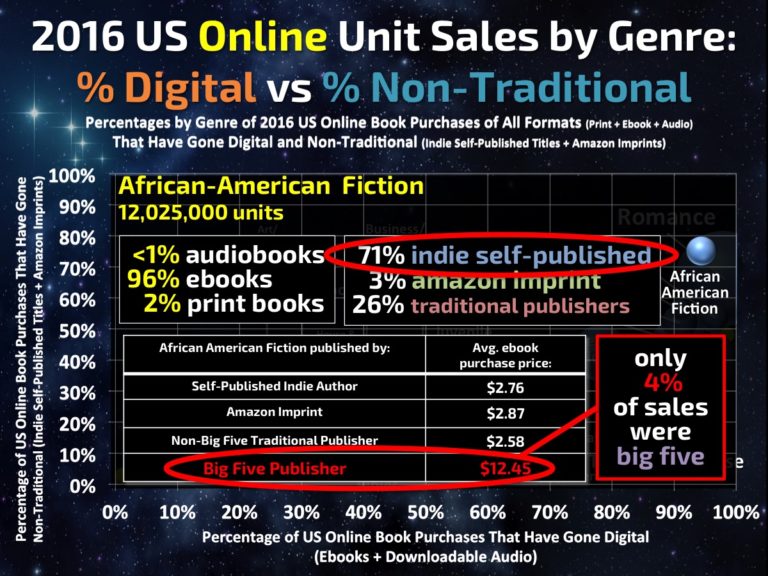 Seventy-one percent of African-American fiction is sold by indie and self-published authors with 96 percent of the unit sales being ebooks.