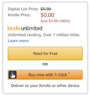 When you give such a book away for free, the book is listed with a price of $0.00, but gets a “Buy it now with 1-click” button that doesn’t say anything about the price—and still has that “Read for free” button that takes you to a Kindle Unlimited signup pitch.