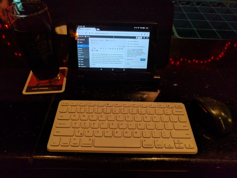 Midway between web browsing and writing comes blogging—something that I am doing on my Fire right now, with Bluetooth keyboard and mouse, while enjoying a dunkels bock at a local brewpub. Needless to say, the process is fairly simple. There’s a decent Android WordPress app, but the web editor for WordPress works perfectly well too. (And I’ve encountered a few odd problems with the WordPress app when it comes to syncing changes written across multiple platforms—but the web editor always has the latest version.)