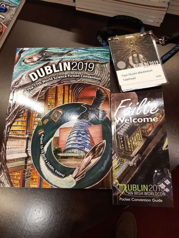In case it wasn’t already clear, TeleRead is now live from Dublin 2019 – an Irish Worldcon. The 77th World Science Fiction Convention has already been running for two very busy days, and will run all the way through a very packed schedule for three more days until its conclusion late Monday afternoon.
